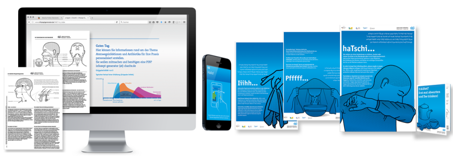 auf der folgenden Seite finden Sie Patienteninformationsmaterialien rund um das Thema Atemwegsinfektionen und Antibiotika. Zusätzlich finden Sie Informationen für (Fern-)Reisende zum Thema Diarrhoe. Bis auf die Patienteninformation für’s Wartezimmer sind die Informationen zum Einsatz im Arzt-Patienten-Gespräch als sogenannte „Infozepte“ konzipiert. Die verbindliche Übergabe von Handlungsempfehlungen durch den Arzt an den Patienten stärkt den Stellenwert solcher Informationen und soll helfen, den Erwartungsdruck hinsichtlich einer (nicht-wirksamen) Antibiotikaverordnung seitens des Patienten zu reduzieren.